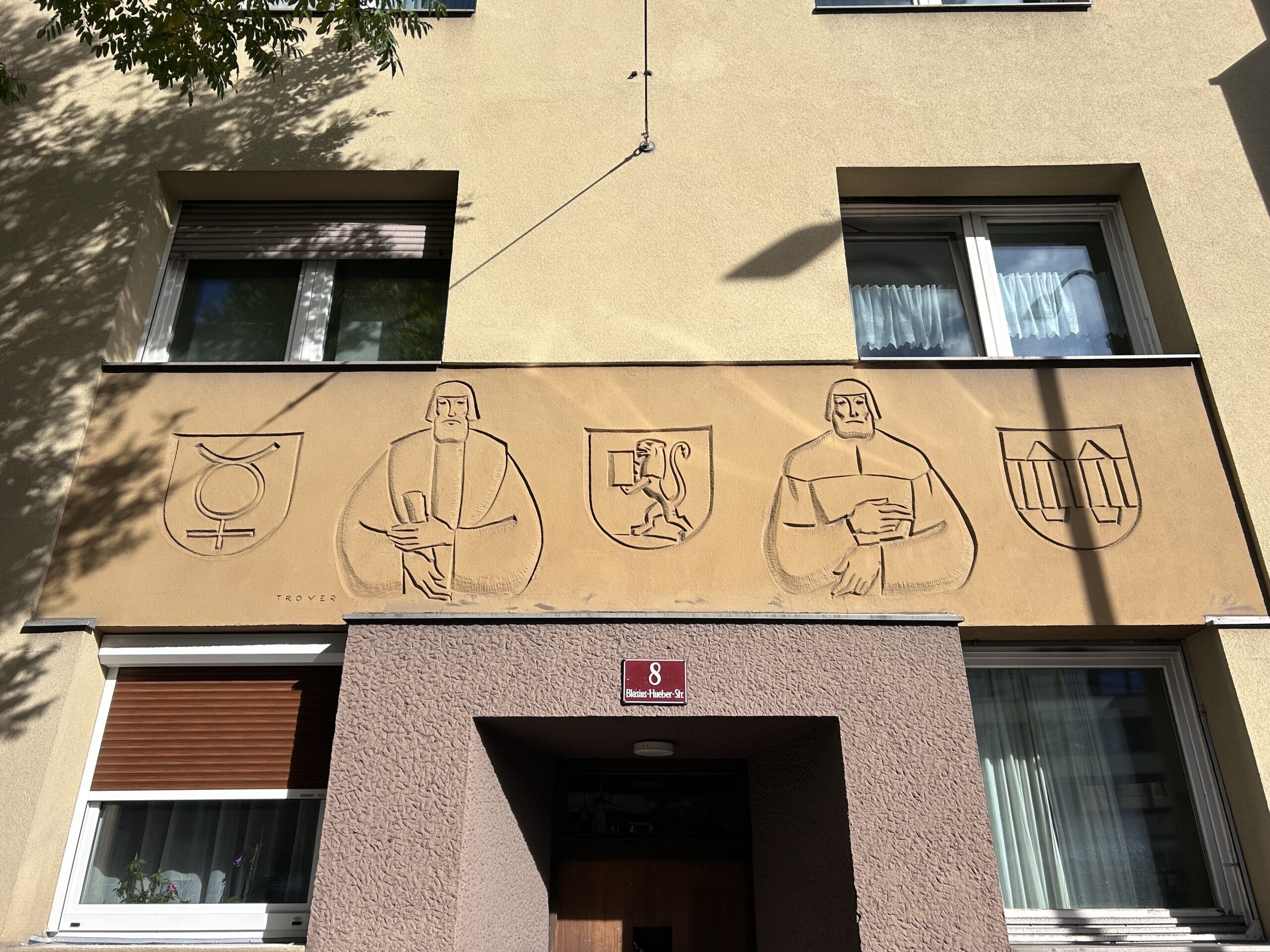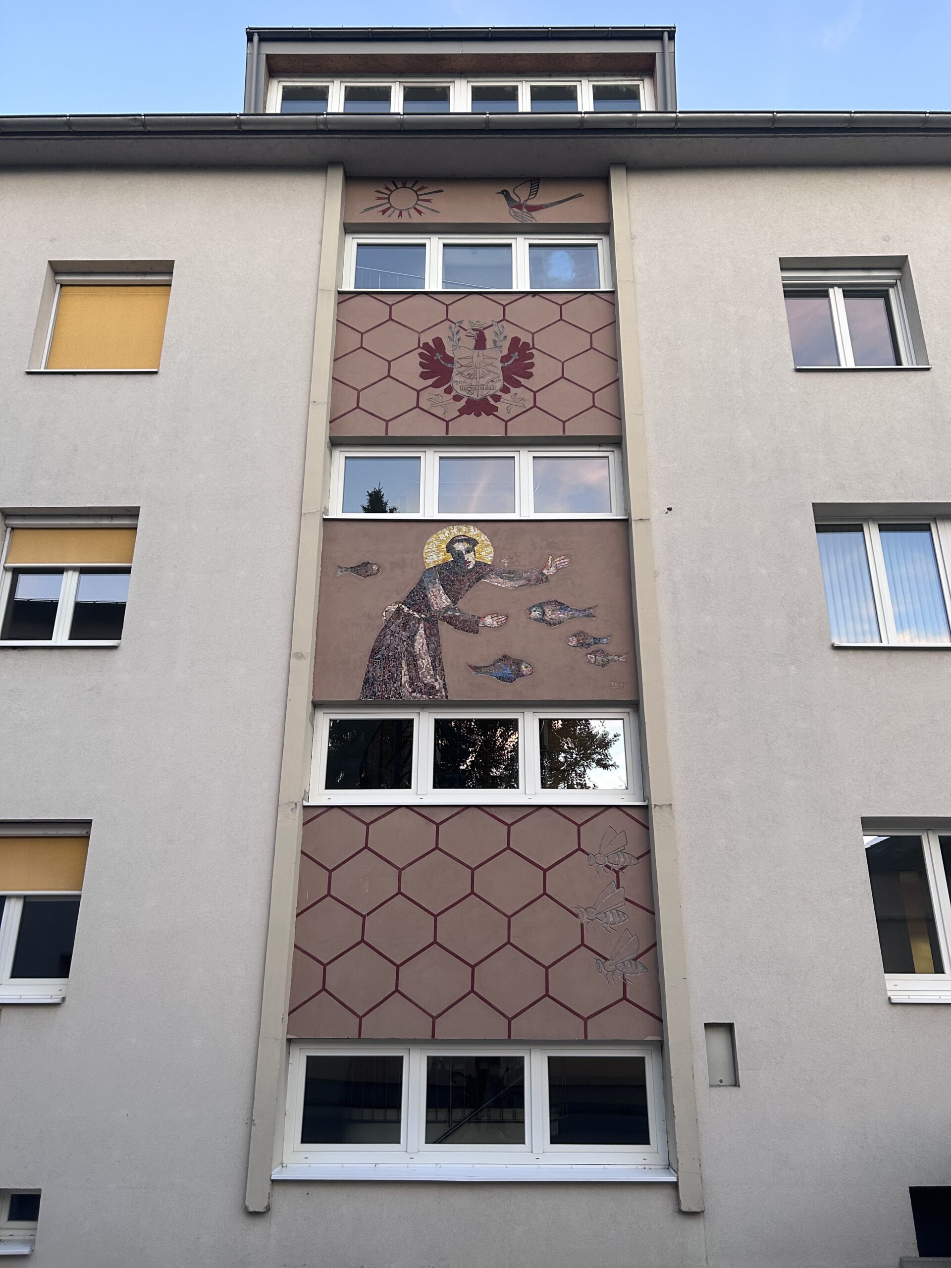 Many of these artists were not only recognised by the Federal Trade School InnsbruckThe school, which is now the HTL and the Academy of Fine Arts in Vienna, was also characterised by the collective experience during the National Socialist era and the war. Fritz Berger had lost his right arm and one eye and had to learn to work with his left hand. Kerle served in Finland as a war painter. He was taught at the Academy of Fine Arts in Vienna by Josef Müllner, among others, an artist who had made his mark on art history with busts of Adolf Hitler, Siegfried from the Nibelungen saga and the Karl Lueger monument in Vienna, which remains controversial to this day. Like a large part of the Tyrolean population, these artists as well as politicians and civil servants wanted peace and quiet after the hard and painful years of war in order to let the events of the past decades grow over. The works created as part of Kunst am Bau reflect this attitude towards a new moral image. It was the first time that abstract, formless art found its way into Innsbruck's public space, even if only in an uncritical context. Fairy tales, legends and religious symbols were popular motifs that were immortalised on sgraffiti, mosaics, murals and statues. One could speak of a kind of second wave of Biedermaier art, which symbolised the petty bourgeois lifestyle of people after the war.