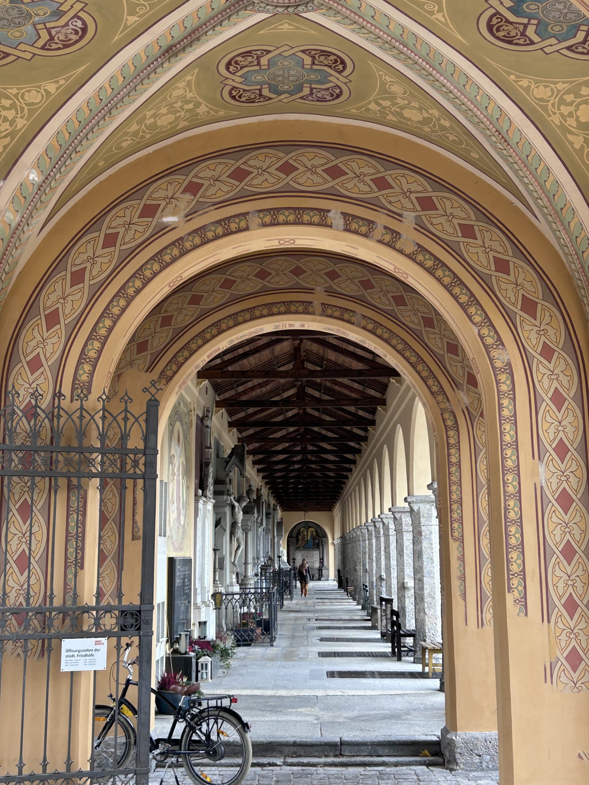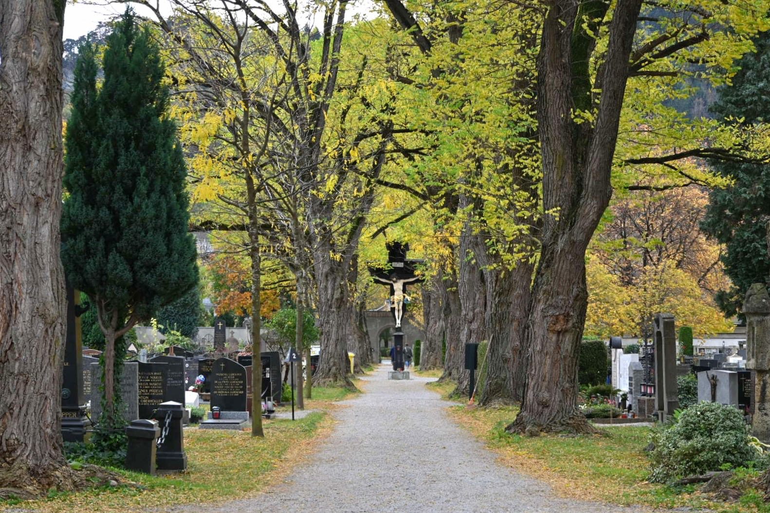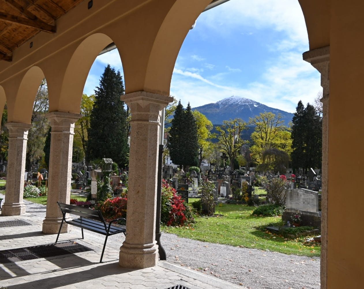 Ein Spaziergang durch die gepflegte Anlage mit ihren alten Bäumen ist wie ein Museumsbesuch und eine Reise in die Vergangenheit. Die Denkmäler und Grabstätten zeigen nicht nur die verschiedensten Kunstrichtungen, sondern geben auch viel über die Begrabenen und die Umstände der jeweiligen Zeit preis. Viele der Grabstätten, wie das Monument der Familie Unterberger und die neogotische Gruft des Innsbrucker Komponisten Josef Pembaur, sind wie die Arkaden mit Malereien im Nazarenerstil versehen und deuten auf die tiefe Frömmigkeit der Beerdigten hin. Der Grabstein des sozialdemokratischen Innsbrucker Politikerehepaares Maria und Martin Rapoldi wurde hingegen als Mosaik im typisch sachlich-republikanischen Stil der Zwischenkriegszeit gestaltet. Die androgyn wirkende Figur trägt Palmzweig und Krone, darunter prangt stolz das Stadtwappen Innsbrucks als säkulares Symbol. Auch das sparsam gehaltene, bürgerliche Ehrengrab Josef Kiebachs trägt das Stadtwappen. Das Grabmal des letzten Landeshauptmanns der k.u.k. Monarchie Josef Schraffl (1855 – 1922) versprüht mit einem barock-leidenden Gekreuzigten und steinernem Adler die allgemeine Stimmungslage des frisch nach dem Ersten Weltkrieg am Brenner geteilten Landes Tirol. Unter Arkade 96 befindet sich die Grablege des großdeutsch-nationalen Bürgermeisters Wilhelm Greils, der einer aus der Antike entsprungenen, verhüllten Frau deutsches Eichenlaub in die Hand gibt. Der Trentiner Bildhauer Andrea Malfatti gestaltete Die Oberer´sche Grabstätte in Arkade 48 mit der Verklärung Christi und die Lodron´sche Grabstätte Trauernde Mädchengestalt in Arkade 52 im italienisch-naturalistischen Stil. 1909 ließ der Innsbrucker Baumeister Josef Retter zentral im neueren, südlichen Teil des Friedhofs eine neogotische Kapelle, die mittlerweile dank ihres romantischen Efeubewuchses als Filmkulisse dienen könnte, als Familiengrablege errichten. Die massive Holztür wird von einem Mosaik umrahmt, das dem Jugendstil nahesteht.