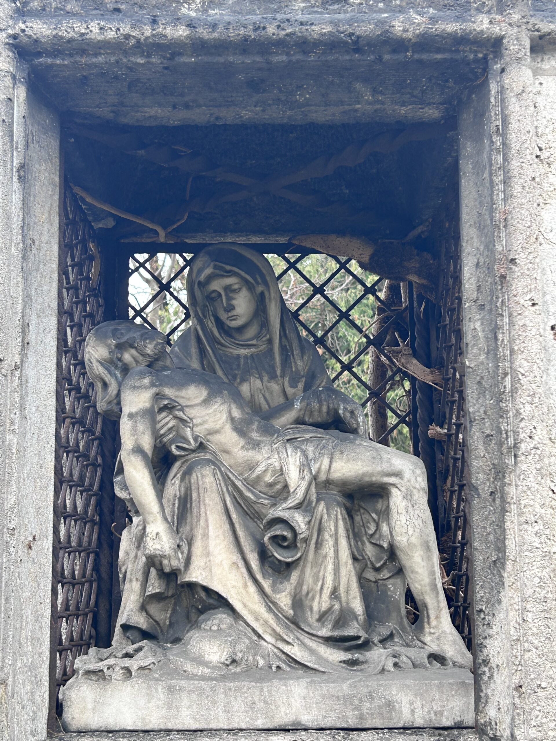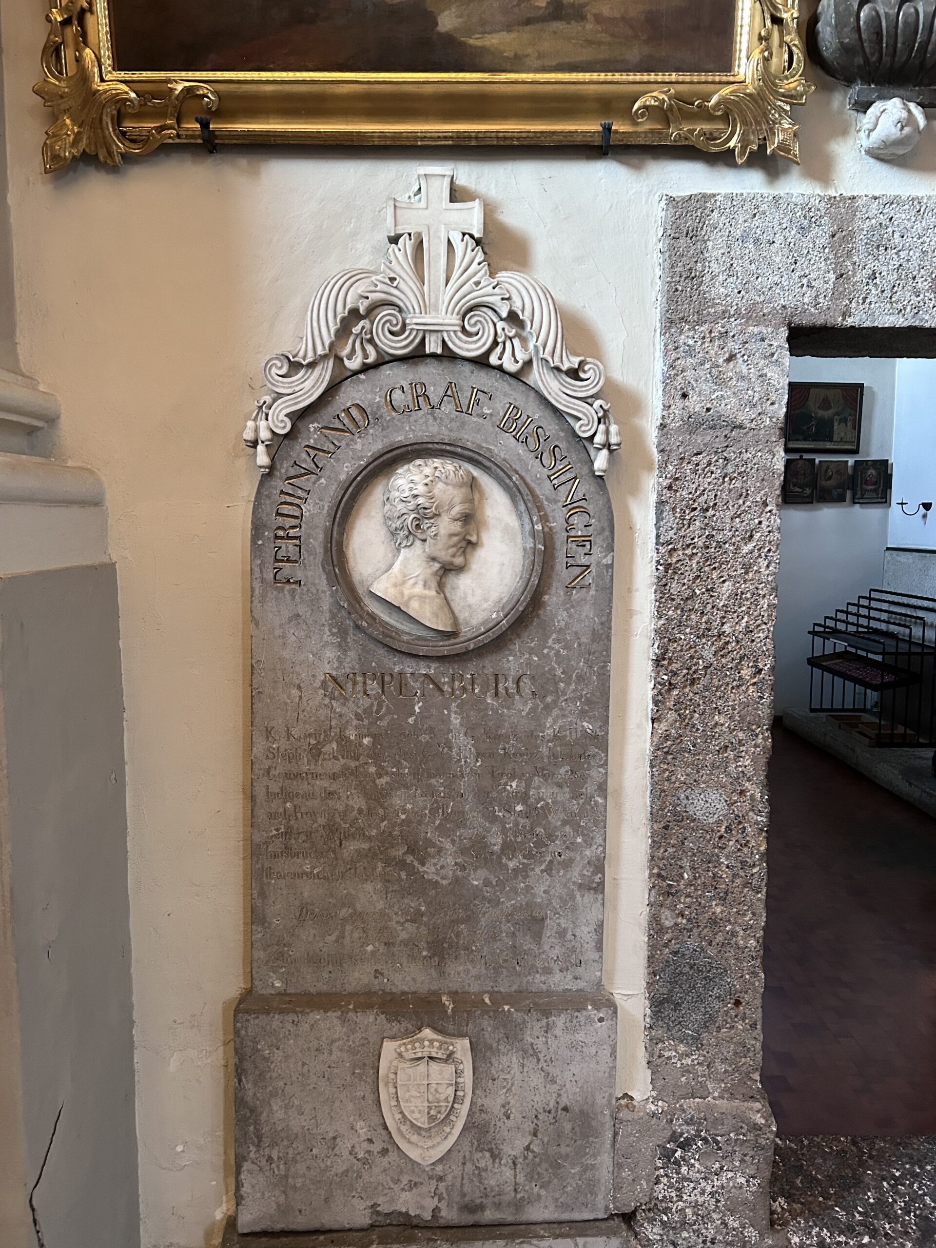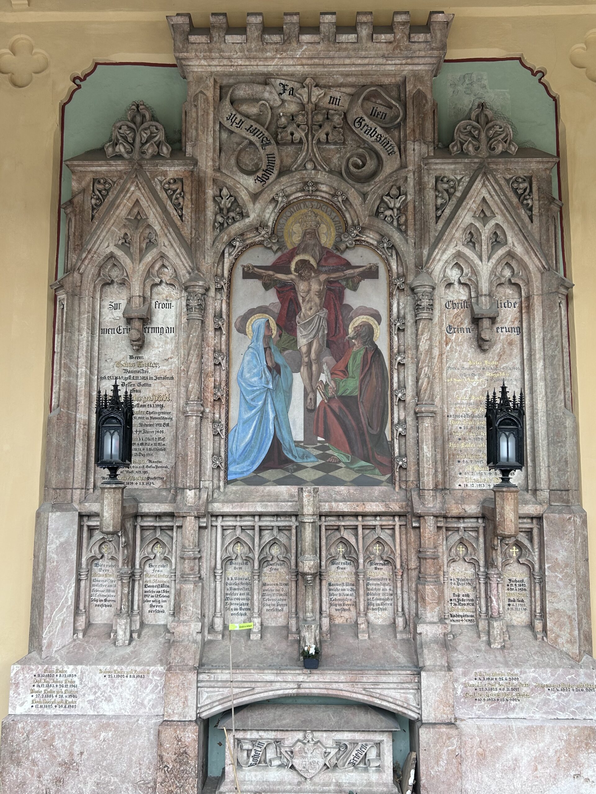 „Den Friedhof nach dieser kurzen Rundschau verlassend, begegnen wir in demselben, theilweise etwas hinter Cypressen versteckt, heuer einem bekannten Denkmale aus dem alten Friedhofe. Das dort gestandene ehemals Wolkenstein'sche Monument hat die Stadtvertretung vom Bildhauer Grissemann restauriren und in sinniger Weise zur Erinnerung an alle aus dem alten Friedhofe übertragenen Ueberreste hier aufstellen lassen. Dieses bedeutende Marmorwerk aus dem Ende des vorigen Jahrhunderts bildet mit seinem etwas geckenhaft die Sanduhr über den hohen Sarg haltenden Alten, dem Gevatter Tod, und der schönen ihm gegenüberstehenden weiblichen Figur, die sich mit Grauen von ihm abwendet, eine Zierde unseres Friedhofes, der nachgerade eine Stätte tirolischer Kunst geworden.“